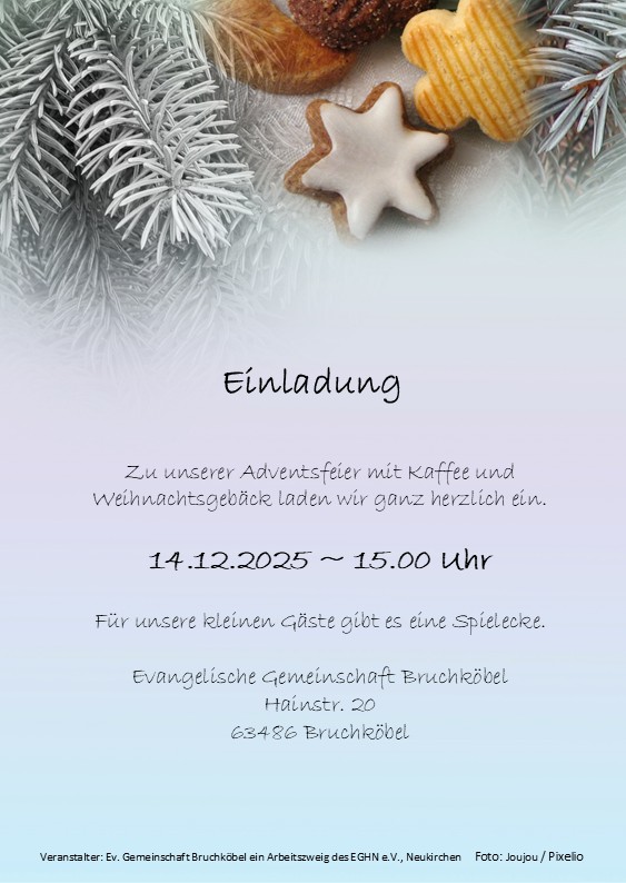 Am 14.12.2025 um 15 Uhr feiern wir Advent mit einem Gottesdienst und anschließendem gemütlichen Beisammensein. Dazu laden wir herzlich ein. Für unsere kleinen Gäste gibt es eine Spielecke.